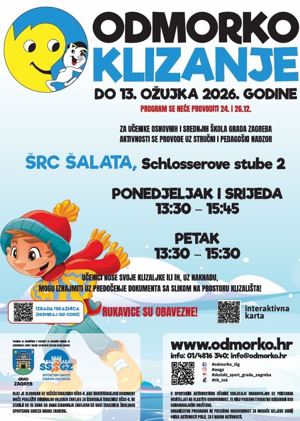 Školski sportski savez Grada Zagreba u petak 21. studenog 2025. godine kreće sa novom sezonom slobodnog klizanja na ŠRC Šalata u okviru programa Odmorko tijekom školske godine.